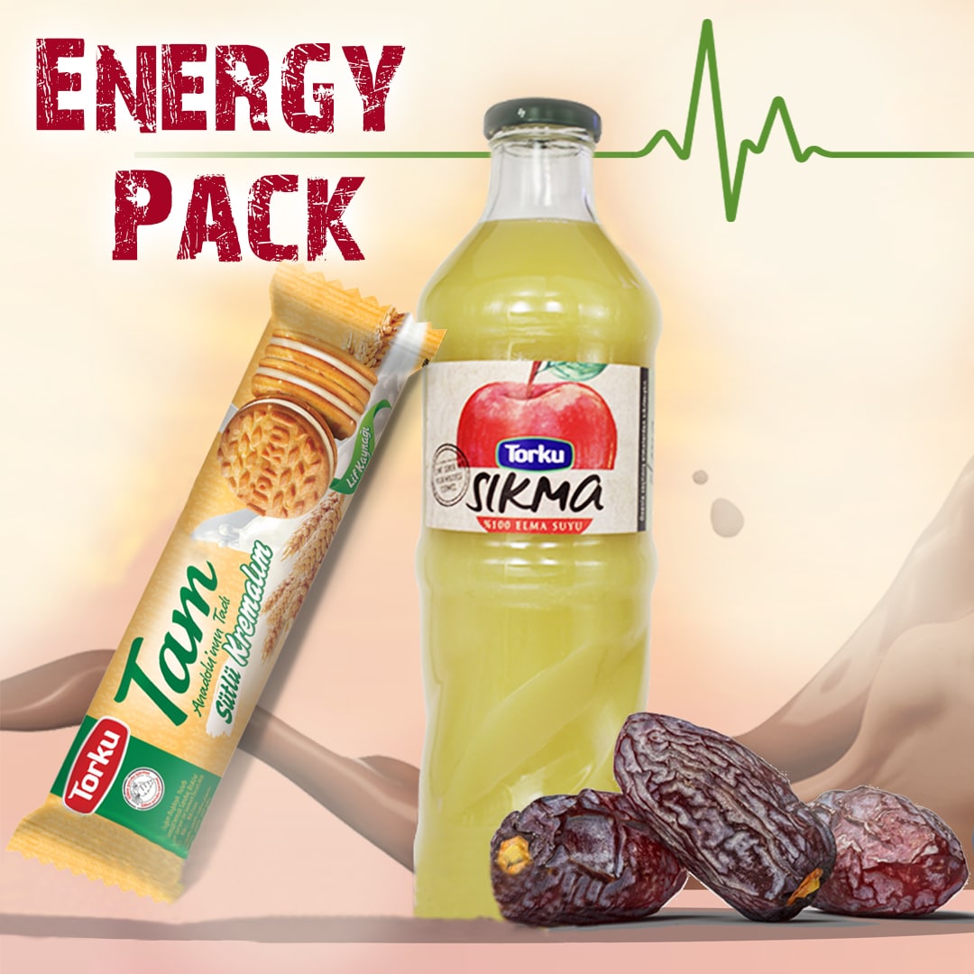Complete energy pack to start your day which includes 100% Squeezed Apple Juice, Sandwich Biscuit and 3 pieces of imported fresh Khodari dates from Saudi Arabia.